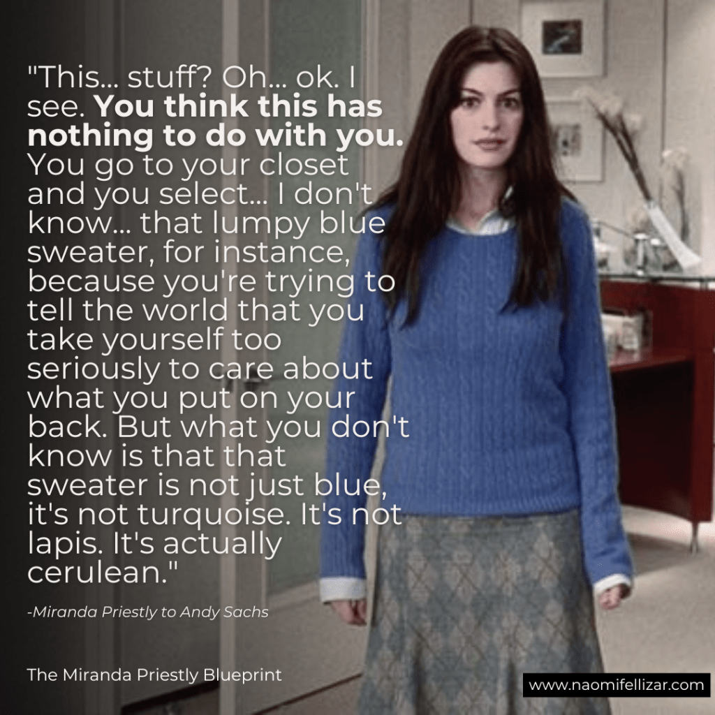 Miranda breaks down how Andy’s “lumpy blue sweater” isn’t just blue – it’s cerulean – and then proceeds to explain the entire fashion science of that particular shade, from Oscar de la Renta’s collection to the clearance bin where Andy got her sweater.