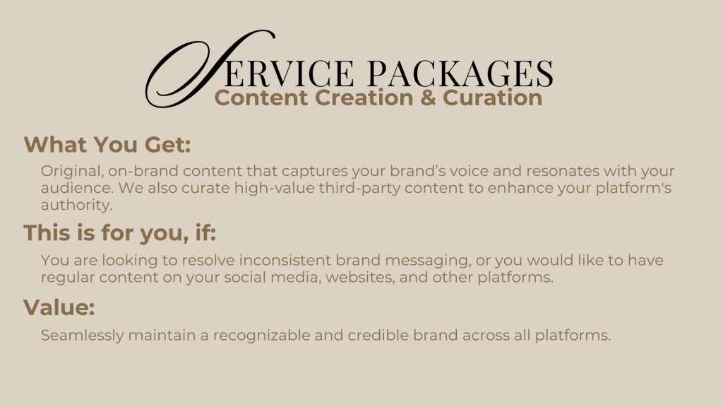 I also offer content curation to enrich your platforms with relevant third-party material that adds value to your audience.